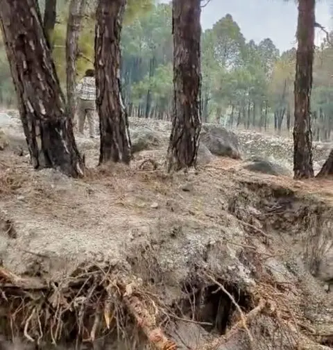 न्यूगल नदी तट पर अवैध खनन से क्षतिग्रस्त हुए देवदार के पेड़