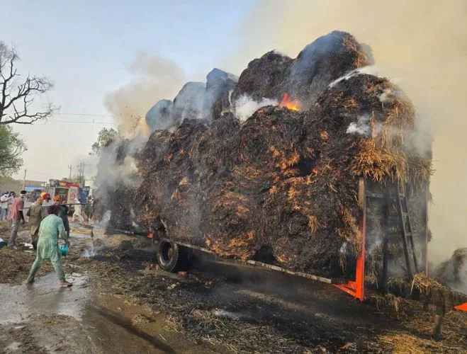 कल शाम अबोहर के गोबिंदगढ़ रोड पर गेहूं के भूसे से लदे एक वाहन में भीषण आग लगने से एक बार फिर उस अवैध प्रथा पर चिंताएं बढ़ गई हैं, जिसे संबंधित अधिकारियों ने रोकने की जहमत नहीं उठाई है। खबरों के मुताबिक, वार्यामखेड़ा गांव के निवासी ड्राइवर देवी लाल अपने ट्रैक्टर-ट्रेलर में गोविंदगढ़ से भूसे की गठ्ठियां ले जा रहे थे। अबोहर को जोड़ने वाली संपर्क सड़क पर प्रवेश करते ही ट्रेलर ऊपर से गुजर रही उच्च वोल्टेज की बिजली की तारों से टकरा गया, जिससे तुरंत आग लग गई। कुछ ही पलों में ट्रेलर आग की लपटों में घिर गया।