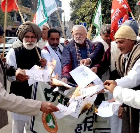 रोहतक में एसकेएम कार्यकर्ताओं ने केंद्र सरकार के खिलाफ विरोध प्रदर्शन किया।