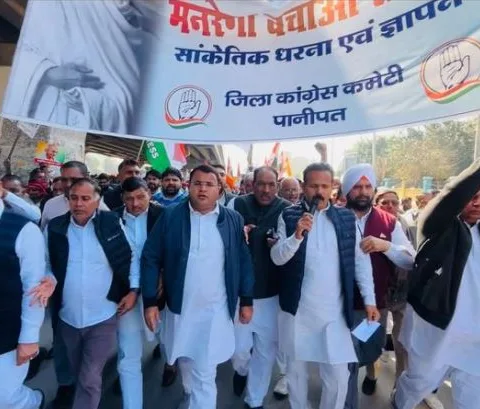 कांग्रेस ने एमजीएनआरईजीए का नाम बदलने के विरोध में करनाल में जिला स्तरीय प्रदर्शन किया।