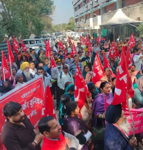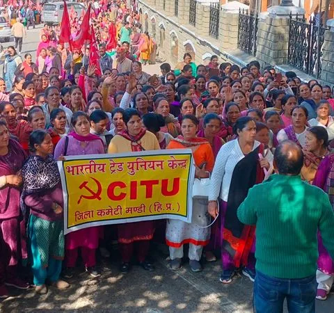 मंडी में भी मजदूर संघों और किसानों ने नए श्रम कानूनों और निजीकरण के खिलाफ विरोध प्रदर्शन किया।