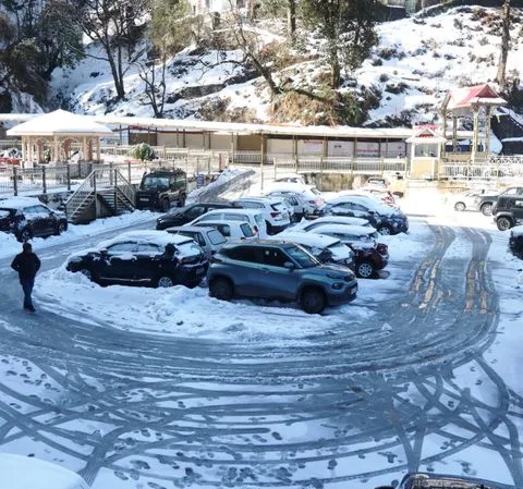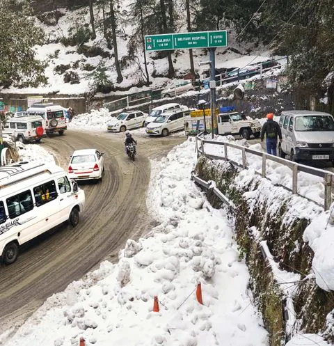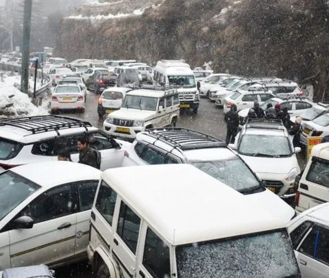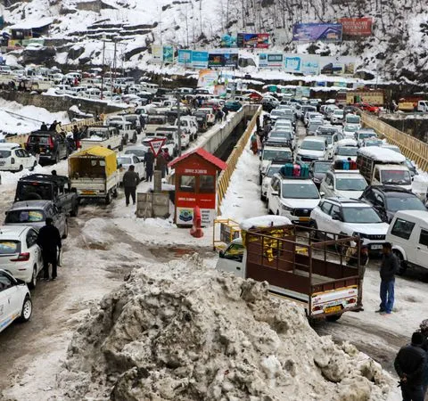 मनाली में पर्यटक बर्फबारी के कारण फंस गए; वाहनों की लंबी कतार बर्फ की सफेद चादर पर धीरे-धीरे चल रही है।