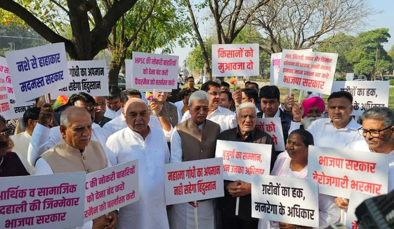 विधानसभा के बजट सत्र में मंगलवार को काफी नाटकीय माहौल देखने को मिला, जब कांग्रेस विधायक कथित भ्रष्टाचार, भर्ती में अनियमितताओं, बढ़ते नशीली दवाओं के दुरुपयोग और बिगड़ती कानून व्यवस्था को लेकर भाजपा सरकार के खिलाफ विरोध प्रदर्शन करते हुए विधानसभा तक मार्च करते हुए पहुंचे। विपक्ष के नेता और पूर्व मुख्यमंत्री भूपिंदर सिंह हुड्डा तथा राज्य कांग्रेस अध्यक्ष राव नरेंद्र सिंह के नेतृत्व में विधायकों ने हाई कोर्ट चौक से विधानसभा तक मार्च किया और कार्यवाही शुरू होने से पहले धरना दिया। हाथों में तख्तियां और खड़खड़ाहट लिए उन्होंने भाजपा सरकार को “बहरा शासन” करार दिया।