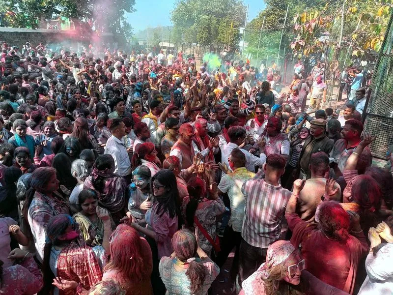 Devotees celebrate Holi with gulal and flowers at Brijraj Temple in Noorpur.