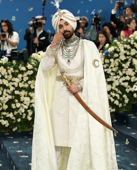 दिलजीत दोसांझ :- एक्टर और सिंगर दिलजीत दोसांझ ने भी मेट गाला में शानदार डेब्यू किया। उन्होंने अपने लुक से पूरी महफिल लूट ली। दिलजीत ने रॉयल महाराजा-इंस्पायर्ड लुक अपनाया और इस लुक के जरिए उन्होंने पटियाला के महाराजा भूपिंदर सिंह को भी श्रद्धांजलि दी। उन्होंने आइवरी और गोल्ड कलर का ट्रेडिशनल आउटफिट पहना था। उनके कुर्ते पर शानदार कढ़ाई का काम था, जिस पर गुरमुखी लिपि में कुछ लिखा हुआ था। अपने लुक को और दमदार बनाने के लिए उन्होंने मैचिंग पगड़ी पहनी थी, जिसको खूबसूरत गहनों से सजाया गया था। दिलजीत ने हाथों में तलवार भी ली हुई थी। उनके पूरे लुक को डिजाइनर प्रबल गुरुंग ने तैयार किया था, जो बेहद रॉयल और स्टाइलिश लग रहा था।