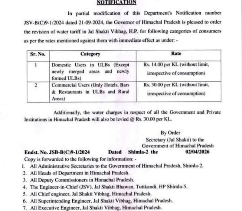 कुल्लू के निवासियों ने हाल ही में जल शुल्क में किए गए संशोधन के लिए मुख्यमंत्री सुखविंदर सिंह ठाकुर और स्थानीय विधायक सुंदर सिंह ठाकुर के प्रति आभार व्यक्त किया है। हालांकि, 2 अप्रैल को जारी अधिसूचना, जो 21 सितंबर, 2024 की अधिसूचना में आंशिक संशोधन करती है, में अक्टूबर 2024 से मार्च 2026 तक लागू होने वाली दरों का उल्लेख नहीं है।