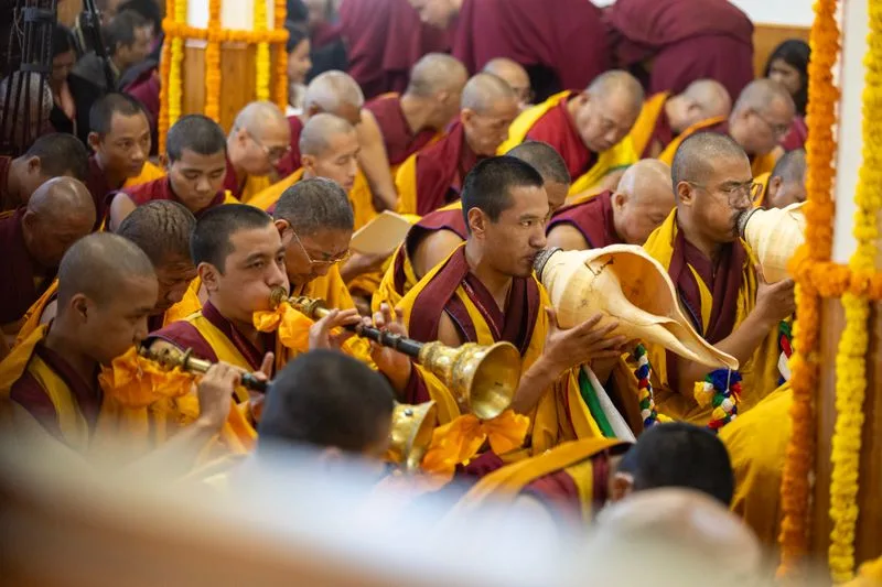 दलाई लामा शरद ऋतु के साफ़ आसमान के नीचे मंदिर पहुँचे, जहाँ ताशी शोल्पा नर्तकों और पारंपरिक वेशभूषा में महिलाओं ने उत्सव गीत गाकर उनका स्वागत किया। गंडेन शार्त्से, ड्रेपुंग गोमांग, ग्युतो और नामग्याल सहित कई प्रमुख मठों के वरिष्ठ मठाधीश और विद्वान, गंडेन त्रिसूर रिनपोछे, शारपा चोजे और ल्हाग्याला रिनपोछे के युवा अवतार के साथ, इस समारोह में शामिल हुए।