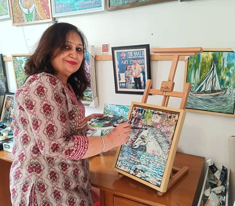कुलजीत कौर कहती हैं, “कला से ज़िंदगी में अलग ही रंग भर जाते हैं। अगर आप अवसाद और नकारात्मकता को दूर रखना चाहते हैं, तो कला आपके लिए एक तारणहार साबित हो सकती है।” जालंधर के एक स्कूल से सेवानिवृत्त प्रिंसिपल कौर को सेवानिवृत्ति के बाद कला के प्रति नया जुनून मिला है। उनका स्टूडियो, प्रिय ईज़ल और कलात्मक सौंदर्यबोध उन्हें रचनात्मक रूप से व्यस्त और हमेशा प्रेरित रखते हैं।