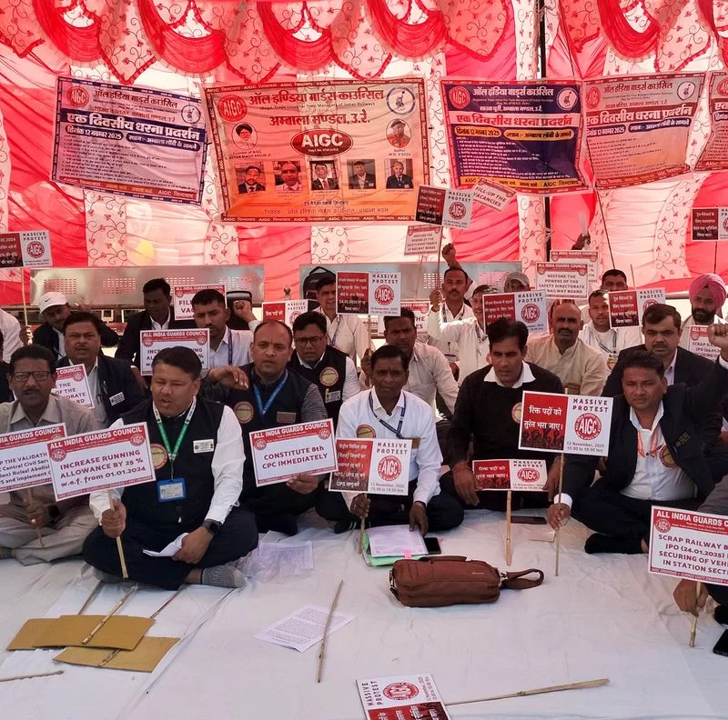 अखिल भारतीय गार्ड्स काउंसिल (एआईजीसी) के बैनर तले ट्रेन प्रबंधकों ने आज अपनी लंबित मांगों के समर्थन में अंबाला छावनी रेलवे स्टेशन पर धरना दिया। उन्होंने अपनी मांगों के समर्थन में नारे लगाए और बाद में अंबाला डिवीजन के डिवीजनल रेलवे मैनेजर (डीआरएम) के माध्यम से रेल मंत्री के लिए एक ज्ञापन सौंपा।