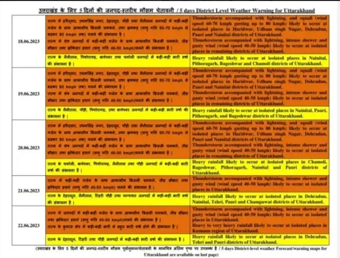 मौसम विज्ञान केंद्र के मुताबिक, 22 जून को भी राज्य के जनपदों में गरज चमक के साथ हल्की से मध्यम बारिश की संभावना है, वहीं देहरादून टिहरी और पौड़ी जिले में कहीं-कहीं भारी वर्षा की संभावना है, जिसको लेकर ऑरेंज अलर्ट जारी किया गया है।